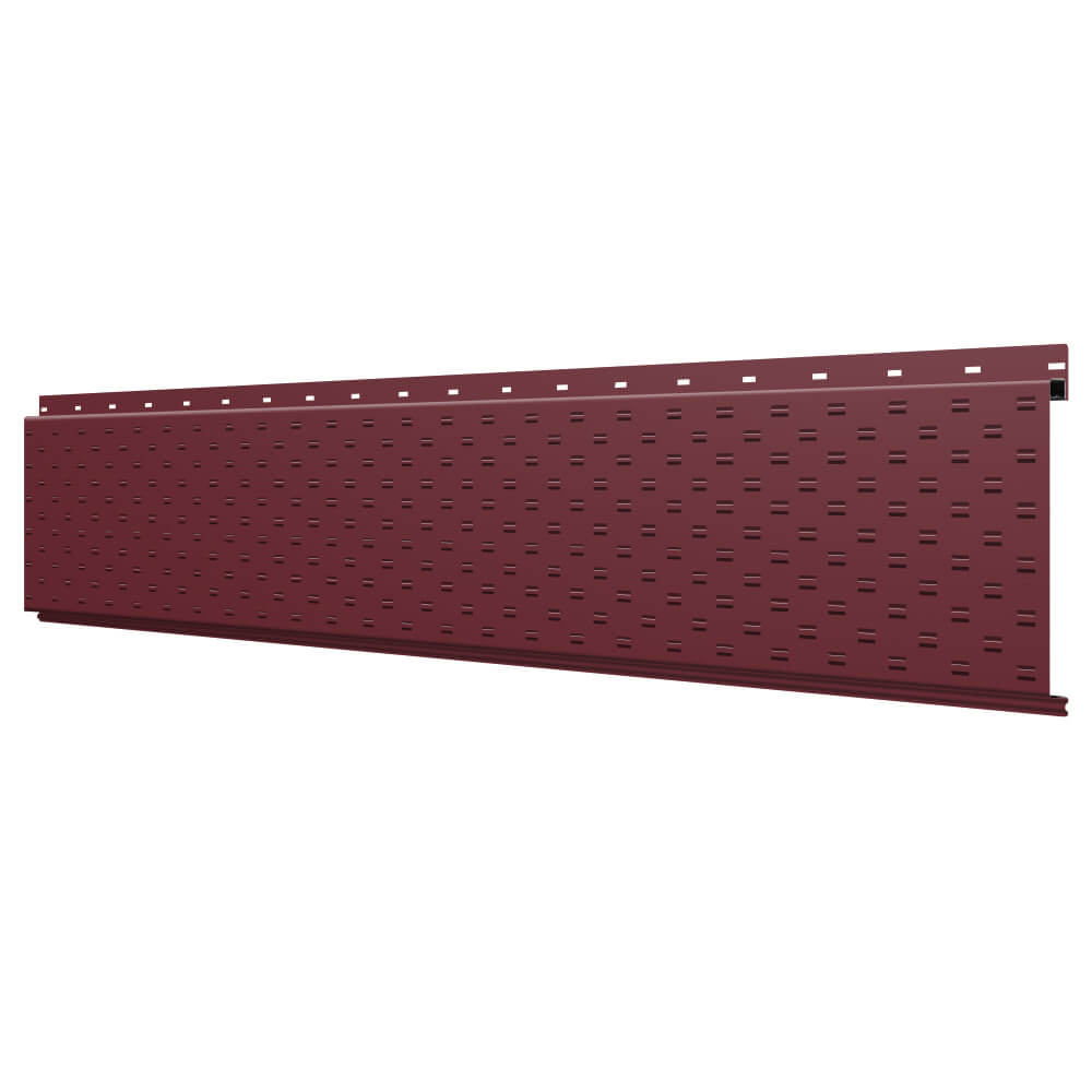 Линеарная потолочно-стеновая панель с ПЕРФОРАЦИЕЙ для вентиляции цвет RAL3005 Красное Вино применяется в качестве софитов для подшивы крыши, наружной и внутренней отделки потолков, стен, фронтонов фасада дома в Усть-Каменогорске.