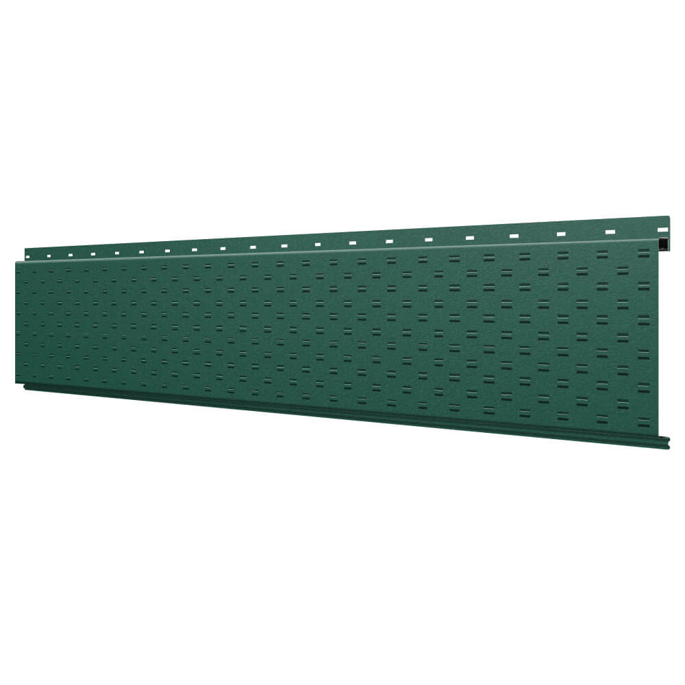 Линеарная потолочно-стеновая панель с ПЕРФОРАЦИЕЙ для вентиляции цвет RAL6005 Зеленый Мох Стальной Бархат применяется в качестве софитов для подшивы крыши, наружной и внутренней отделки потолков, стен, фронтонов фасада дома в Усть-Каменогорске.