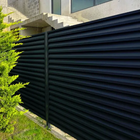 Современное и практичное ограждение — двусторонний горизонтальный секционный забор с ламелями «Реснички» в покрытии RAL 9005 MATTE Черный матовый. Конструкция выглядит стильно и лаконично благодаря ровной линии горизонтальных планок и глубокому насыщенному цвету. Ламели расположены так, что ограждение одинаково эстетично смотрится с обеих сторон, создавая эффект аккуратности и завершённости на всем участке. Матовое покрытие не бликует, подчеркивая выразительный силуэт секций, а прочная конструкция гарантирует долговечность и стойкость к погодным условиям.