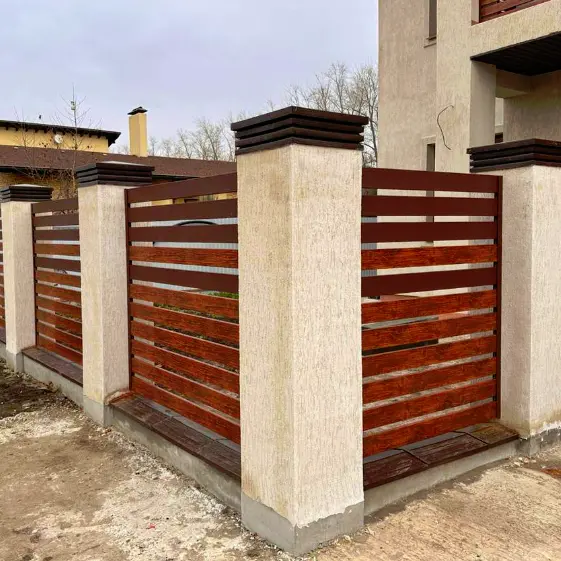 Для реализации ограждения в стиле ранчо было выбрано эффектное сочетание материалов: тёплая текстура металлопланкена под дерево Тёмный Дуб 3D гармонично сочетается с матовым металлопланкеном в покрытии МАТТЕ цвета RAL 8017 Шоколад. Контраст натуральной древесной фактуры и глубокого матового оттенка придаёт забору выразительность и современный характер, а также подчёркивает аккуратность линий и надежность конструкции. Такое оформление делает ограждение не просто функциональным элементом участка, но и стильным архитектурным акцентом.