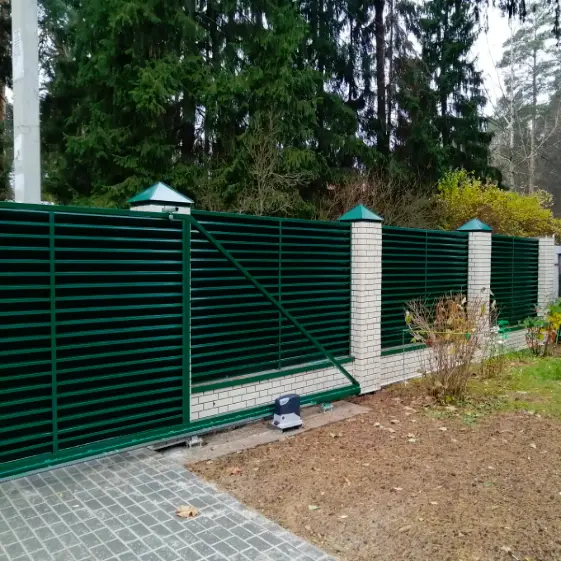 Горизонтальный секционный забор жалюзи с ламелями ЭКО-Z в эксклюзивном цвете RAL6005 Зеленый Мох с двусторонним покрытием. Этот забор демонстрирует идеальное сочетание современного дизайна и природной гармонии – насыщенный оттенок зеленого создает естественную интеграцию ограждения в ландшафт, при этом подчеркивая статусность объекта. Двустороннее покрытие обеспечивает безупречный внешний вид как со стороны участка, так и с улицы, а система жалюзи гарантирует оптимальный баланс между приватностью и естественной вентиляцией.